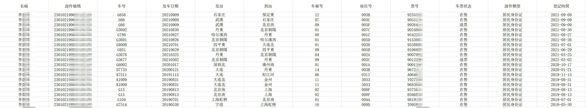 火车记录:车号,发车日期,发站,到站,车厢号,座位号,票号,车票状态。