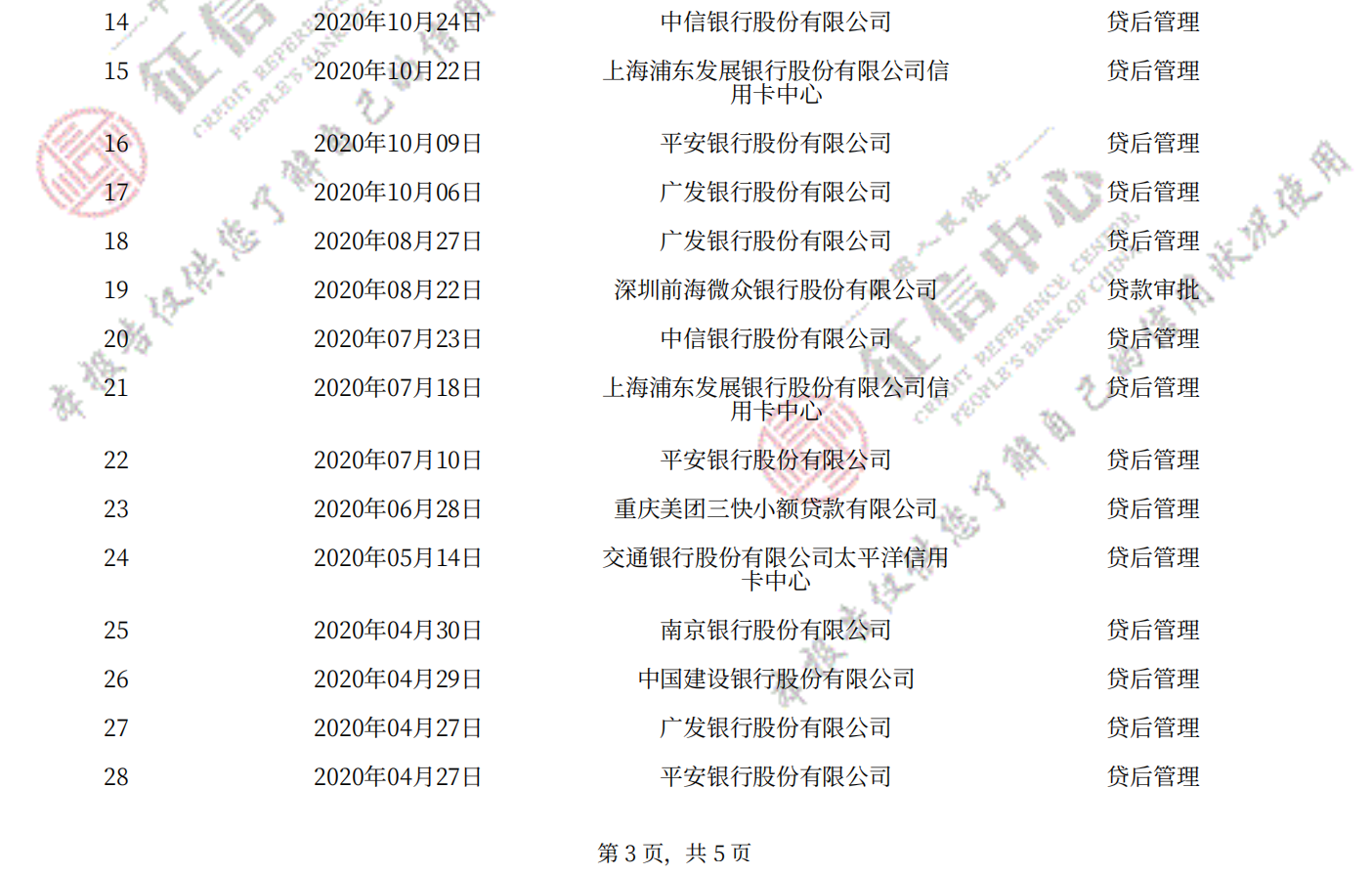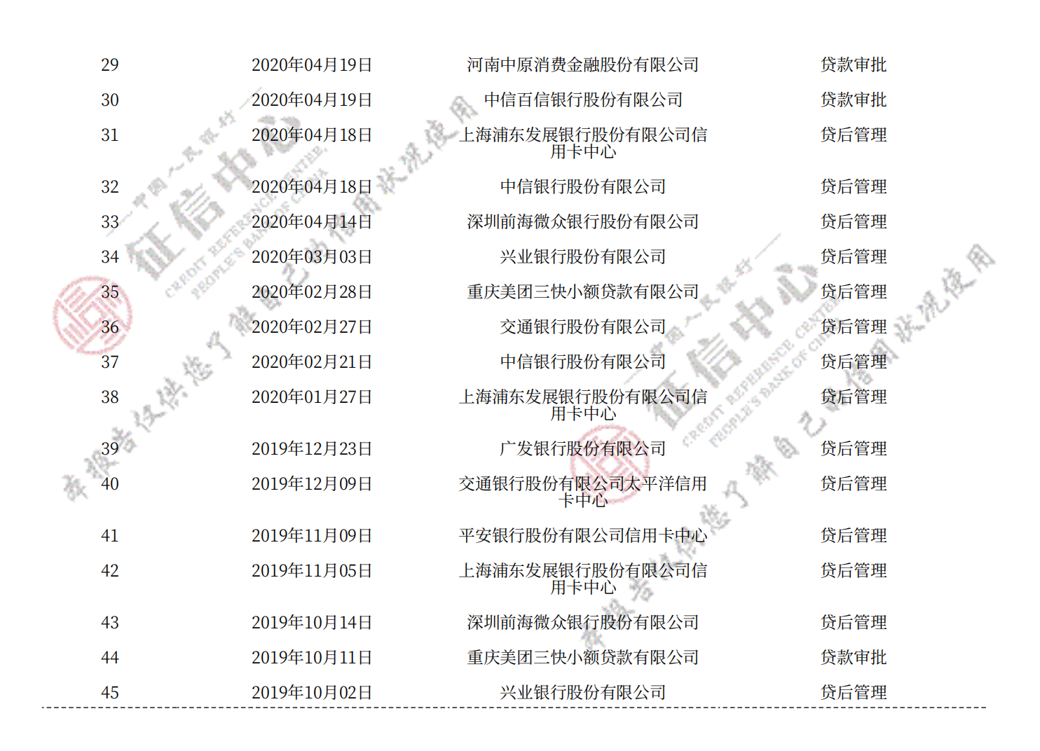 个人信用报告:根据个人的信用信息,生成个人信用报告,包括个人基本信息、信用卡使用情况、贷款记录、逾期记录等内容。