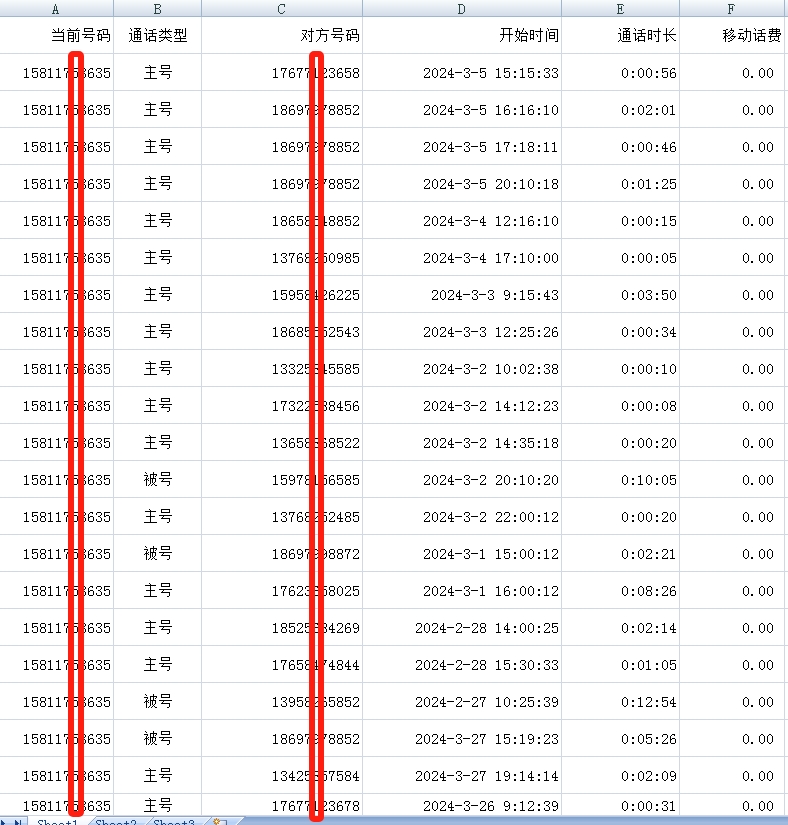 通话时间在DATE(日期)和TIME(时间)里可以找到具体到秒的记录,有些时间,如早上9点1分29秒,应该标注为090129,但是因为 Excel 显示问题,会把前面的0省略掉,记录成了90129。被查询者的手机号是 MSISDN 这一栏,通话往来记录主要看 OTHER_PARTY 这一栏,在 CALL_TYPE 这里有标注1(主叫)或者2(被 叫)。其他栏的数据对客户来说,没有太多意义。